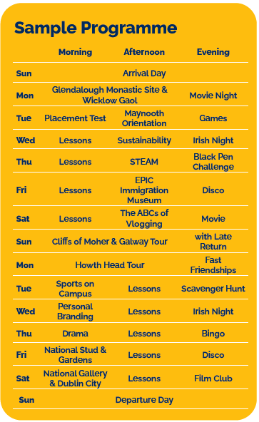 Escursioni e Visite: sono previste 3 escursioni di un’intera giornata in alcune destinazione della famosa Wild Atlantic Way, un percorso turistico di circa 2,500 km, che include Galway e Cliffs of Moher, Glendalough e Wicklow Gaol, Howth. Sono inoltre previste escursioni di mezza giornata a Dublino.