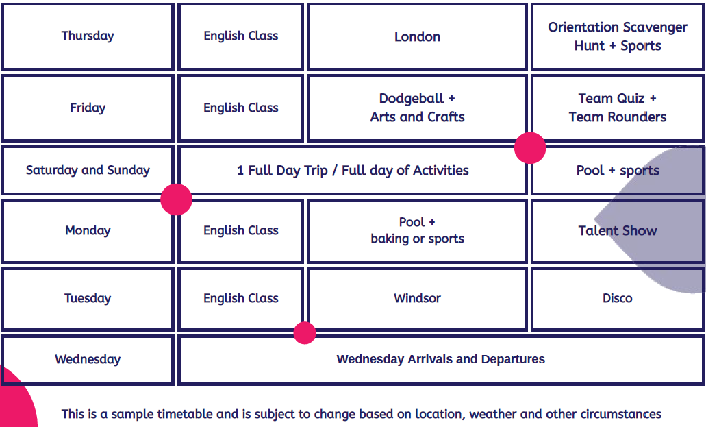 Escursioni e visite (Discover England): oltre 3 escursioni di una giornata a Londra, Brighton e Oxford, sono previste 4 escursioni di mezza giornata a Winchester, Windsor, Londra e Winkworth.